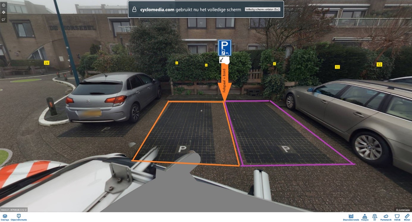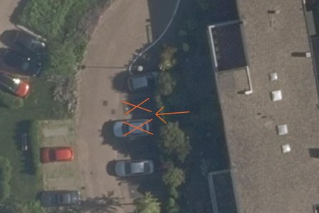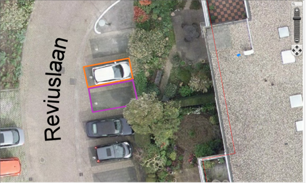 Eén laadpaal (twee parkeervakken): Verkeersbord E8c met onderbord pijlen (OB504). Bij plaatsing wordt het oranje parkeervak gereserveerd. Als de vraag naar laden hoog wordt, dan wordt ook het paarse parkeervak gereserveerd.